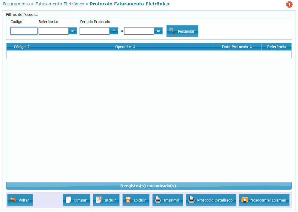 Voltar Ao clicar no botão "Voltar" a tela é fechada voltando para a tela de Faturamento Eletrônico (Sem envio arquivo XML padrão TISS) |