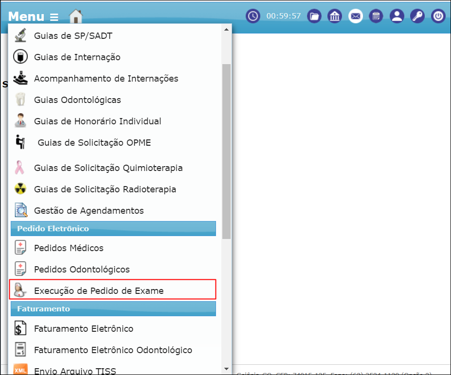 Para emitir guias médicas ou odontológicas por pedido, localize o Menu no canto superior esquerdo da tela e clique nele, em seguida clique no item Execução de Pedido de Exame.