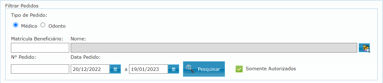 Número da matrícula - campo para a definição do número da matrícula do beneficiário vinculado ao pedido a ser pesquisado. É automaticamente preenchido ao escolher um registro na tela de Pesquisa de Beneficiários ou quando um número de matrícula válido é informado. Este campo é obrigatório.