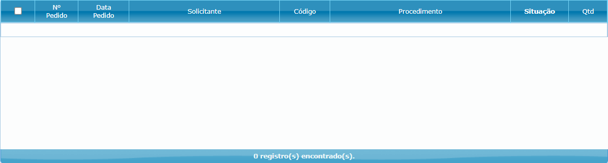 Tabela de gestão de procedimentos Médicos - lista os pedidos de acordo com a pesquisa realizada, utilizando-se os filtros de pesquisa. A listagem é feita por número do pedido, data do pedido, profissional solicitante, código, procedimento, situação e quantidade. A tabela possui um campo para selecionar os pedidos que farão parte da guia.