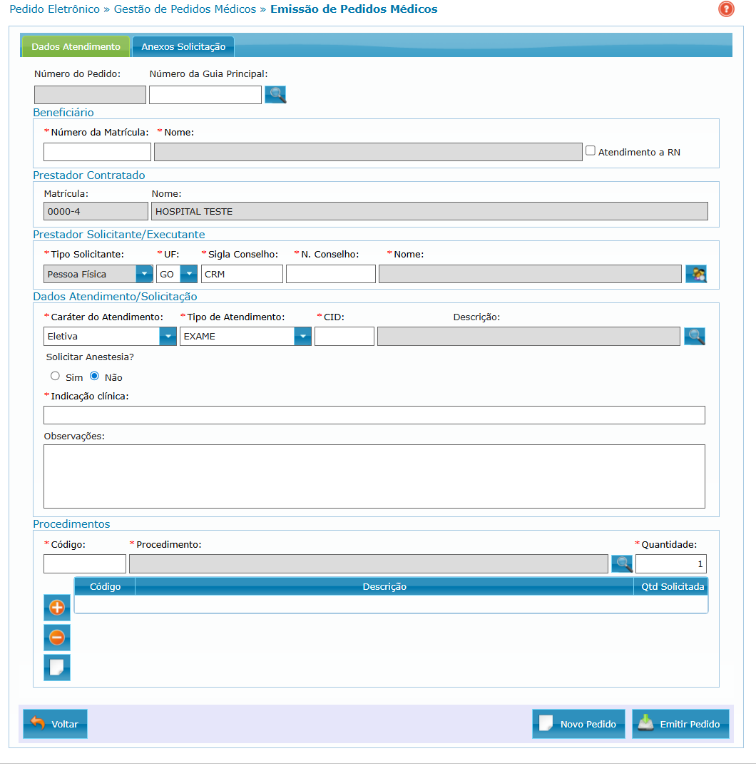 Nela, os dados do prestador contratado são carregados automaticamente. O operador deverá informar dados como número da guia principal (se necessário), beneficiário, prestador solicitante/executante, dados do atendimento/solicitação, procedimentos e observações, caso necessário.