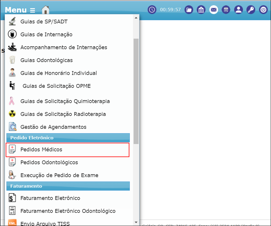 Para realizar a gestão de pedidos médicos, localize o Menu no canto superior esquerdo da tela e clique nele, em seguida clique no item Pedidos Médicos.