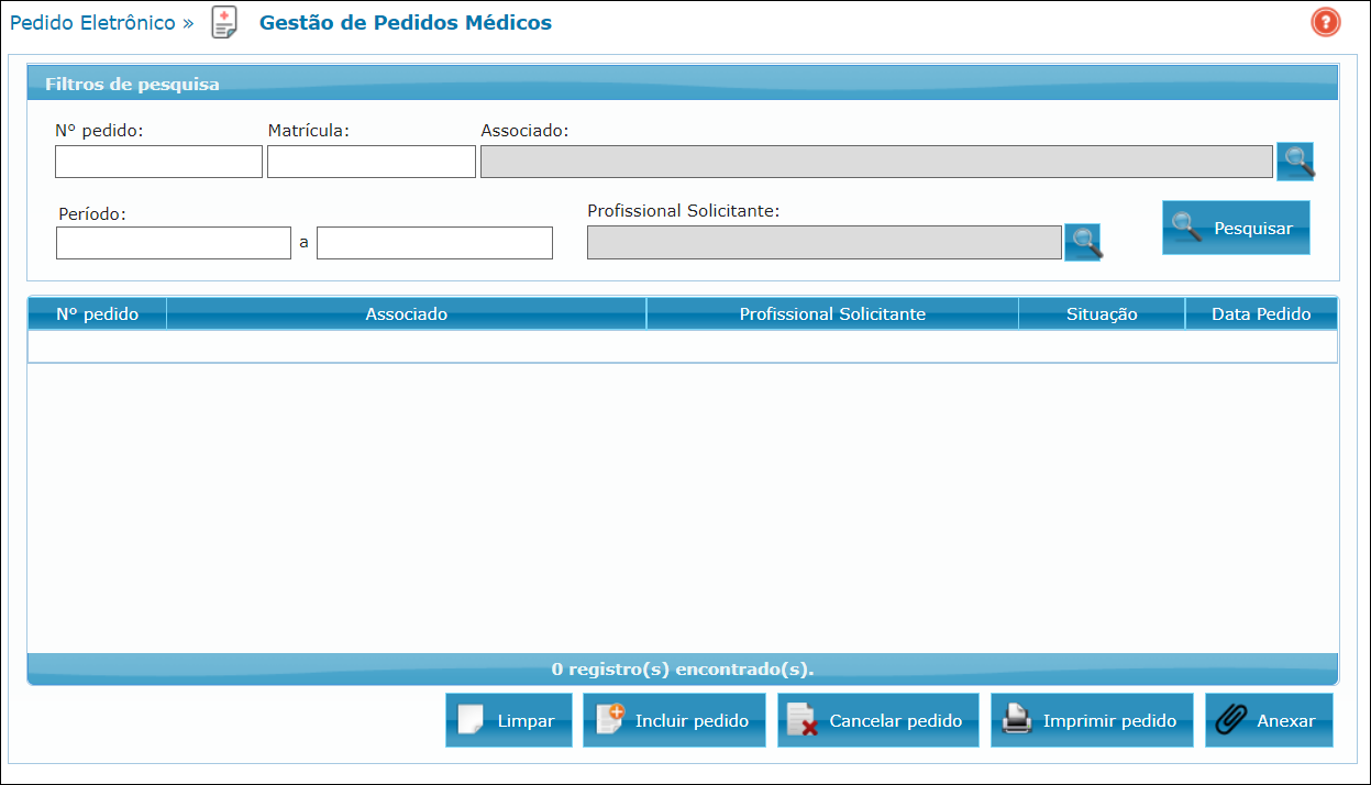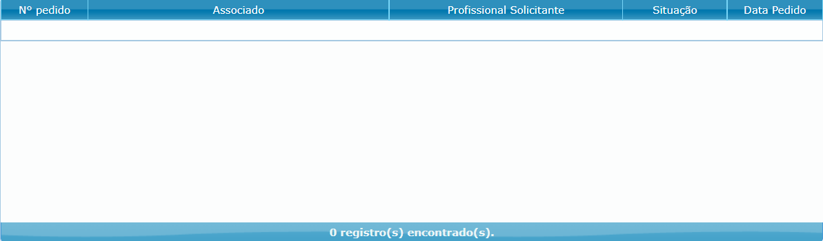 Nela, o operador poderá informar o código do pedido, beneficiário, intervalo de inclusão ou prestador solicitante para realizar sua pesquisa. Após clicar no botão Pesquisar, os resultados encontrados de acordo com os filtros de pesquisa definidos serão listados na tabela. Para excluir ou imprimir um pedido, primeiramente o operador deverá selecionar o registro desejado na tabela e em seguida clicar no botão respectivo a ação que deseja executar.